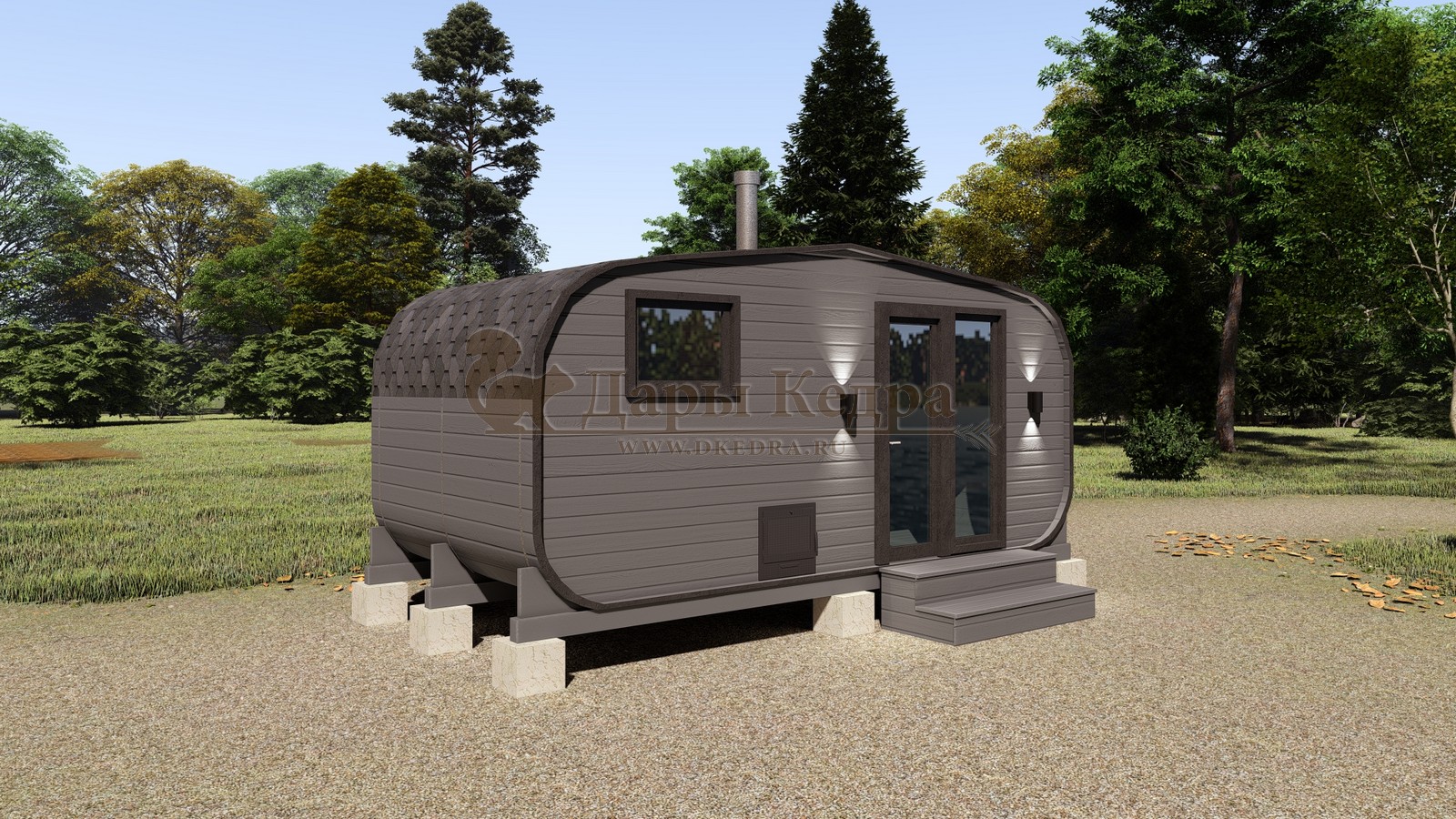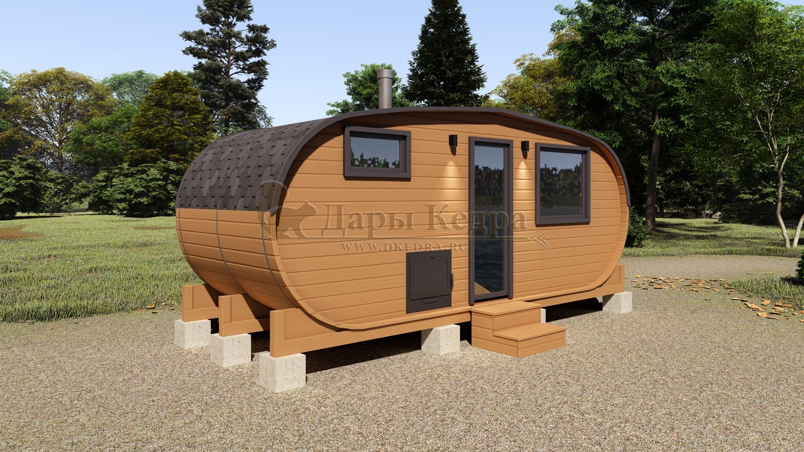 Баня-бочка буханка из кедра с боковым входом (все размеры) Это самая просторная модель бани. Благодаря этому ее можно использовать не только по назначению, но и в качестве летнего домика. Боковой вход у такой модели находится в начале или в середине конструкции. Моечная оснащена душевым поддоном. Двухуровневый открытый полок и лавочка в парилке сделает принятие процедур более комфортным. По вашему желанию баню-бочку можно дополнить печью с внешней загрузкой, благодаря которой весь мусор после топки останется на улице. Баня-бочка буханка из кедра с боковым входом не требует полноценный фундамент, поэтому при необходимости ее можно перенести в другое место. Обращаем Ваше внимание, что в стандартную комплектацию бани входят полки открытого типа в парной с обеих сторон. Дополнительно можно заказать полок закрытого типа или лавку! Кедр обладает ароматическими свойствами. Он не деформируется и влагоустойчив, при правильном уходе за деревом на нем не развиваются грибки и плесень.