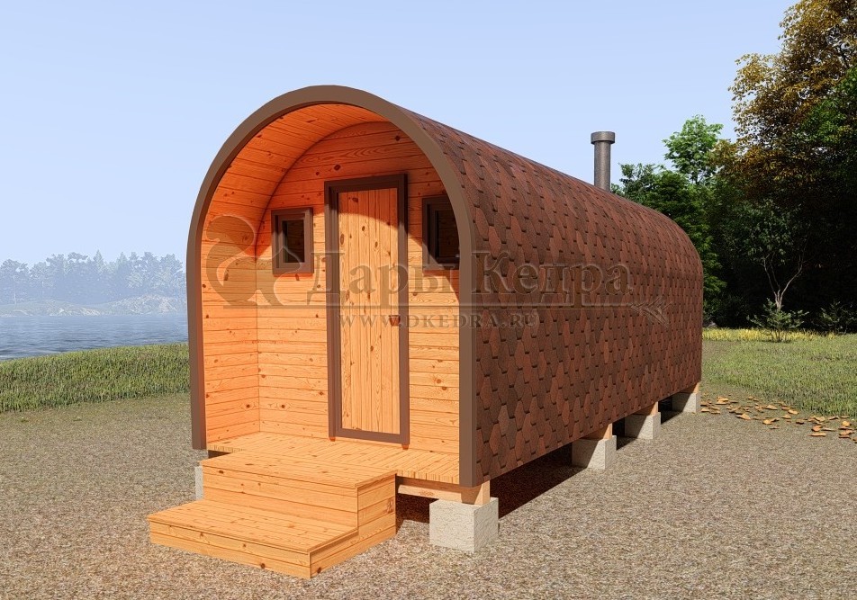 Баня-бочка буханка из кедра 6 метров с верандой Главной отличительной особенностью данной бани «Буханка» является полная обшивка гибкой черепицей всей внешней части бани, а так же наличие крытой входной группы. Включает в себя небольшую веранду, раздевалку, которая служит комнатой отдыха, моечную и парильное отделение. Для удобства пользования в раздевалке находятся лавочки и вешалка из кедра. Моечная оборудована душевым поддоном, полочкой и лавочкой. В парильном отделении по обе стороны расположены двухуровневые открытые полки, печь установлена между ними у дальней стены. Время растопки такой бани не превышает 30 минут. По вашему желанию баню-бочку можно укомплектовать козырьком, верандой и печью с внешней загрузкой, благодаря которой весь мусор после топки остается на улице. Баня-бочка буханка не требует полноценный фундамент, поэтому при необходимости ее можно перенести в другое место. Обращаем Ваше внимание, что в стандартную комплектацию бани входят полки открытого типа в парной с обеих сторон. Дополнительно можно заказать полок закрытого типа или лавку! Кедр обладает ароматическими свойствами. Он не деформируется и влагоустойчив, при правильном уходе за деревом на нем не развиваются грибки и плесень.