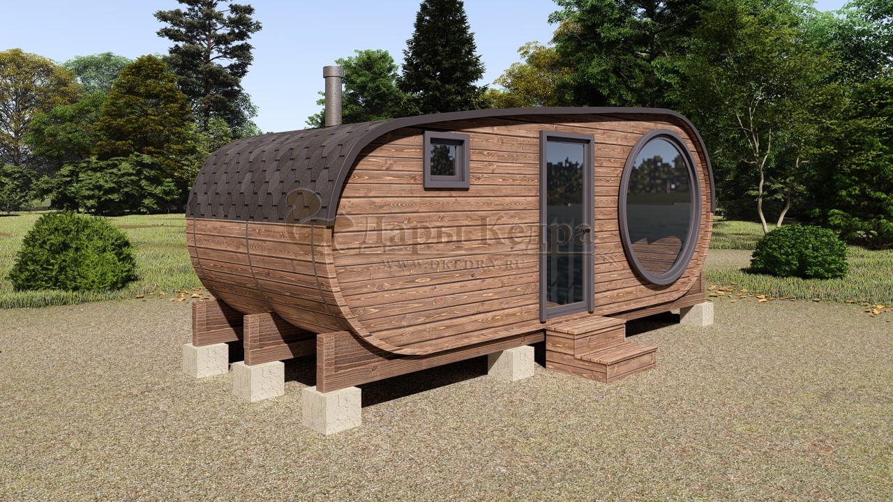 Баня-бочка круглая из кедра 4 метра Это изделие круглой вытянутой формы с двумя отделениями: раздевалкой и парной. Лавочки из кедра находятся по всей длине бани-бочки с обеих сторон. Печь расположена в парилке около дальней стены. Для удобства пользования в раздевалке установлена вешалка и полочка из кедра. За счет небольшой конструкции баня нагревается не более 30 минут. По вашему желанию баню-бочку можно дополнить печью с внешней загрузкой, благодаря которой весь мусор после топки останется на улице. Круглая баня-бочка не требует полноценный фундамент, поэтому при необходимости ее можно перенести в другое место. Обращаем Ваше внимание, что в стандартную комплектацию бани входят лавки в парной с обеих сторон. Дополнительно можно заказать полок открытого или закрытого типа! Кедр обладает ароматическими свойствами. Он не деформируется и влагоустойчив, при правильном уходе за деревом на нем не развиваются грибки и плесень.