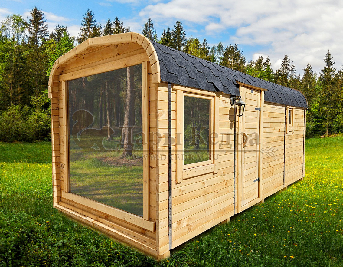 Баня-бочка овальная из кедра 6х2,2 метра (вариант 1) Овальная баня-бочка из кедра просторная и вместительная. Имеет два отделения: раздевалку, которую можно использовать как комнату отдыха, и парилку. Для удобства пользования раздевалка оснащена лавочкой, полкой и вешалкой из кедра. В парильном отделении располагается печь и двухуровневый открытый полок. Для установки такой модели не требуется полноценный фундамент, поэтому при необходимости ее можно перенести на другое место. Так же баню-бочку можно укомплектовать верандой со скамейками, козырьком и печью с внешней загрузкой, благодаря которой весь мусор после топки останется на улице. Древесина кедра насыщена эфирными маслами и фитонцидами, которые активируются при воздействии температур. Таким образом, парение в каркаско-щитовых банях из кедра вдвойне полезно.